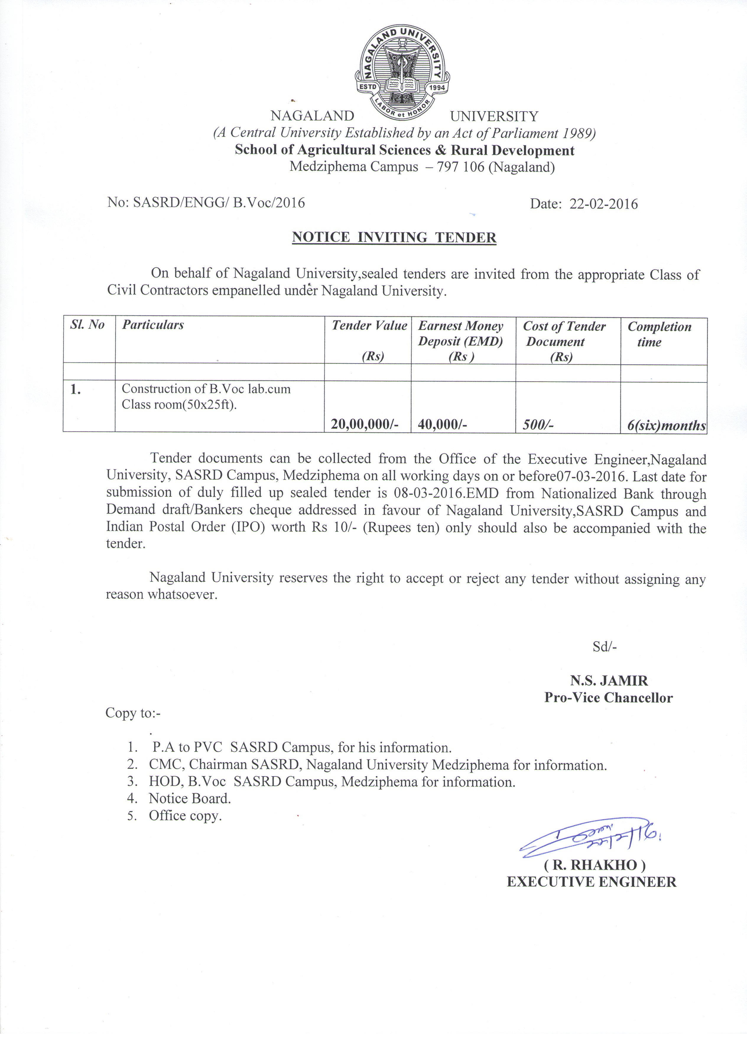 Sealed tenders are invited from Civil Contractors emapanelled under Nagaland University for CO B.Voc Lab at NU, SASRD, Medziphema. Details below:
