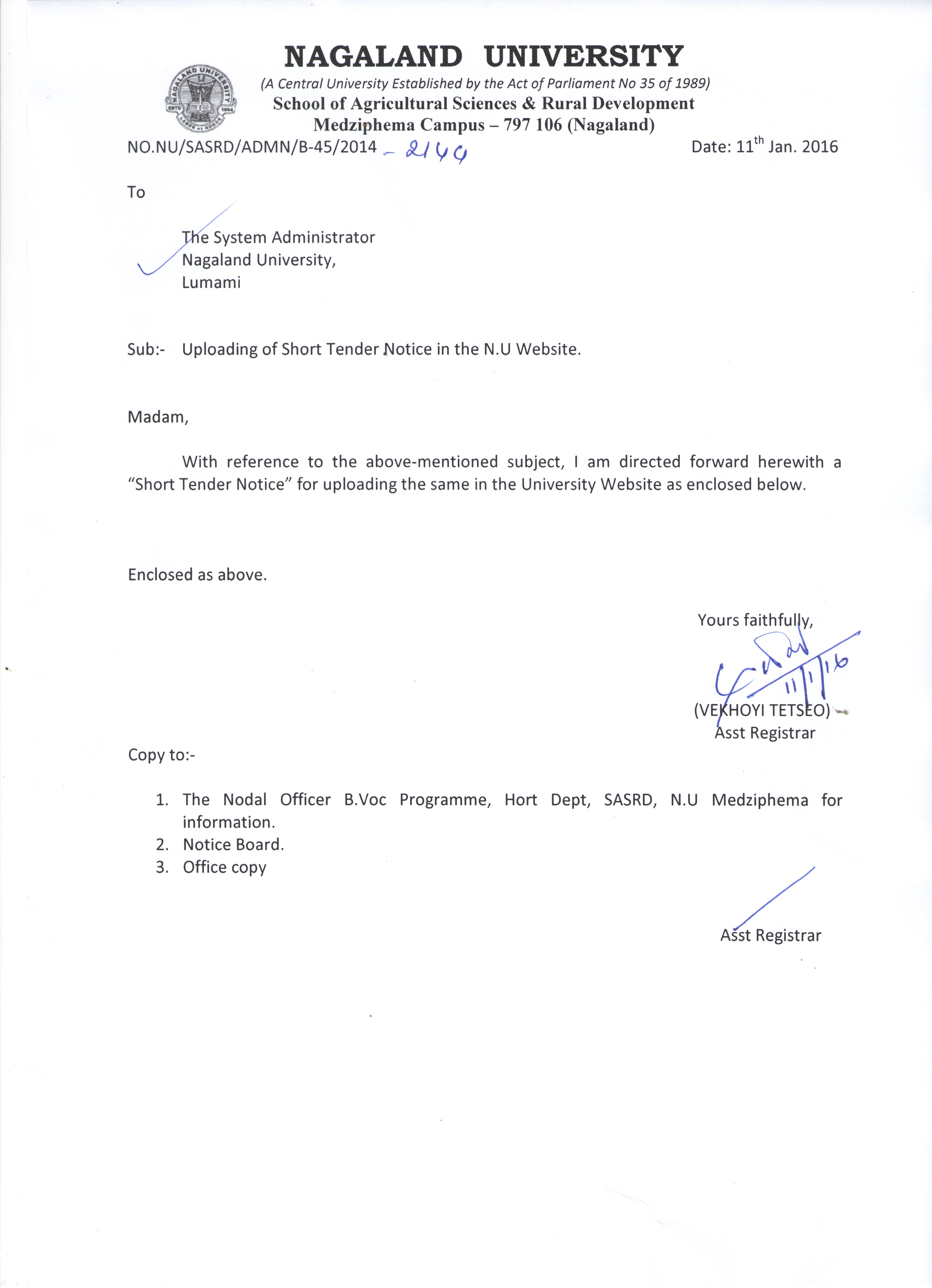 Sealed rate quotations are invited from interested reputed registered firms/Authorized Dealers/Manufacturers of equipments as listed in the Annexure for supply and installation at Horticulture Dept.(B.VOC) SASRD, NU Medziphema. More details below: